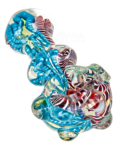 The Triple Blown Ribboned Spoon Hand Pipe w/ Multi Knockers finds vibrant ribbons in a simple ringed spoon pipe design. The high quality triple blown very thick borosilicate lends to its heat resistance and a sense of ruggedness. For such a concealable and portable pipe, it is highly durable with its very thick glass and sure to carry you through regular usage.